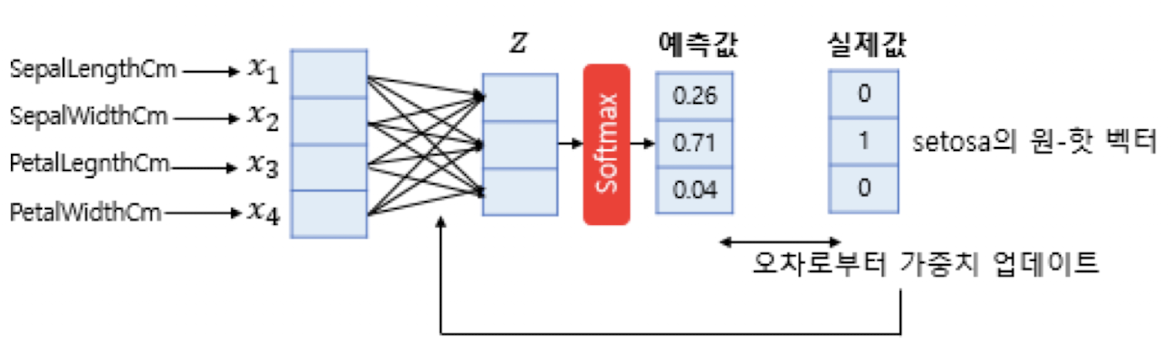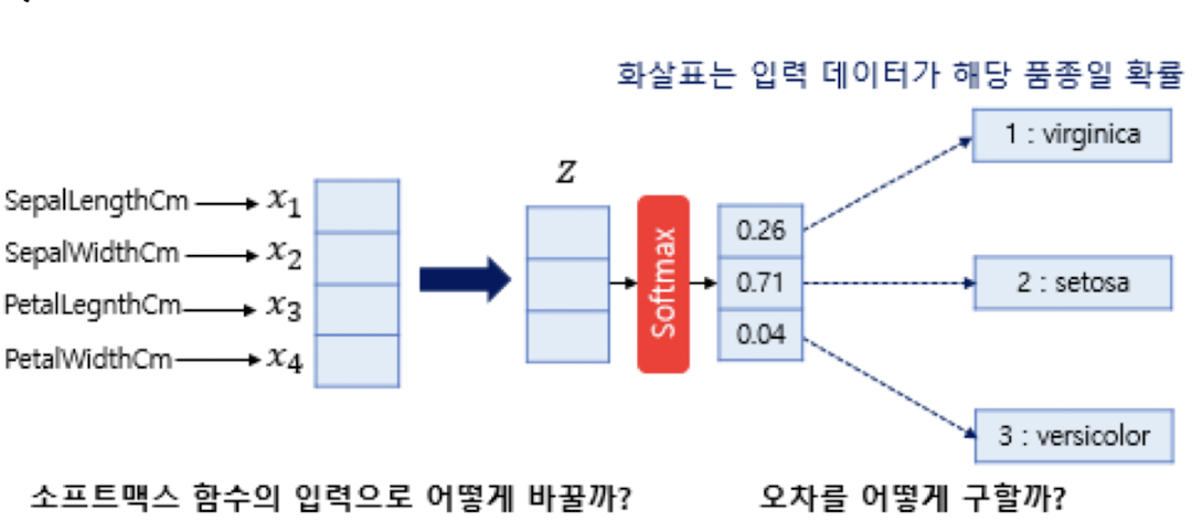 하나의 샘플 데이터의 독립 변수 4차원 벡터, 소프트맥스 함수는 3차원 벡터를 입력으로 받음.