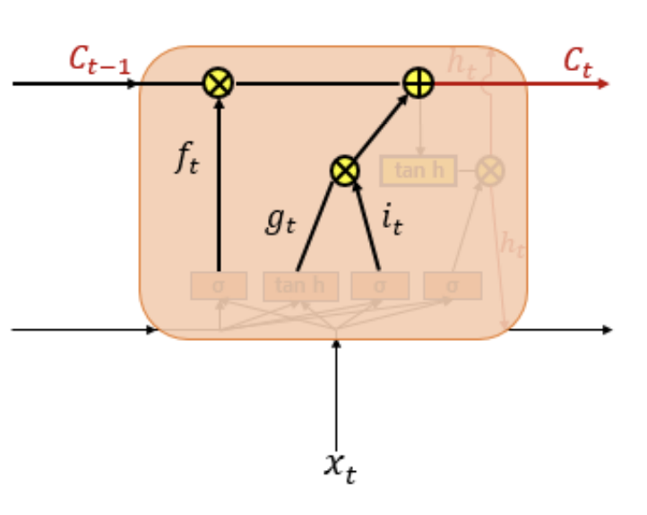 이전 시점의 셀 상태가 다음 시점의 셀 상태를 구하기 위한 입력으로 사용됨