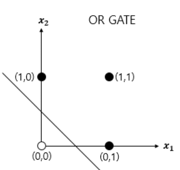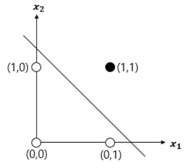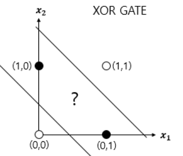 단층 퍼셉트론은 직선 하나로 두 영역을 나눌 수 있는 문제에서만 답을 구할 수 있다.