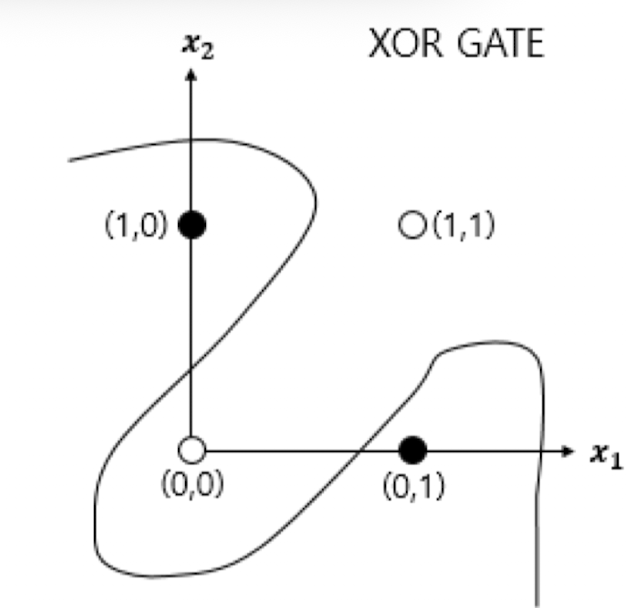 XOR Gate는 곡선, 비선형 영역으로 분리하면 구현이 가능함