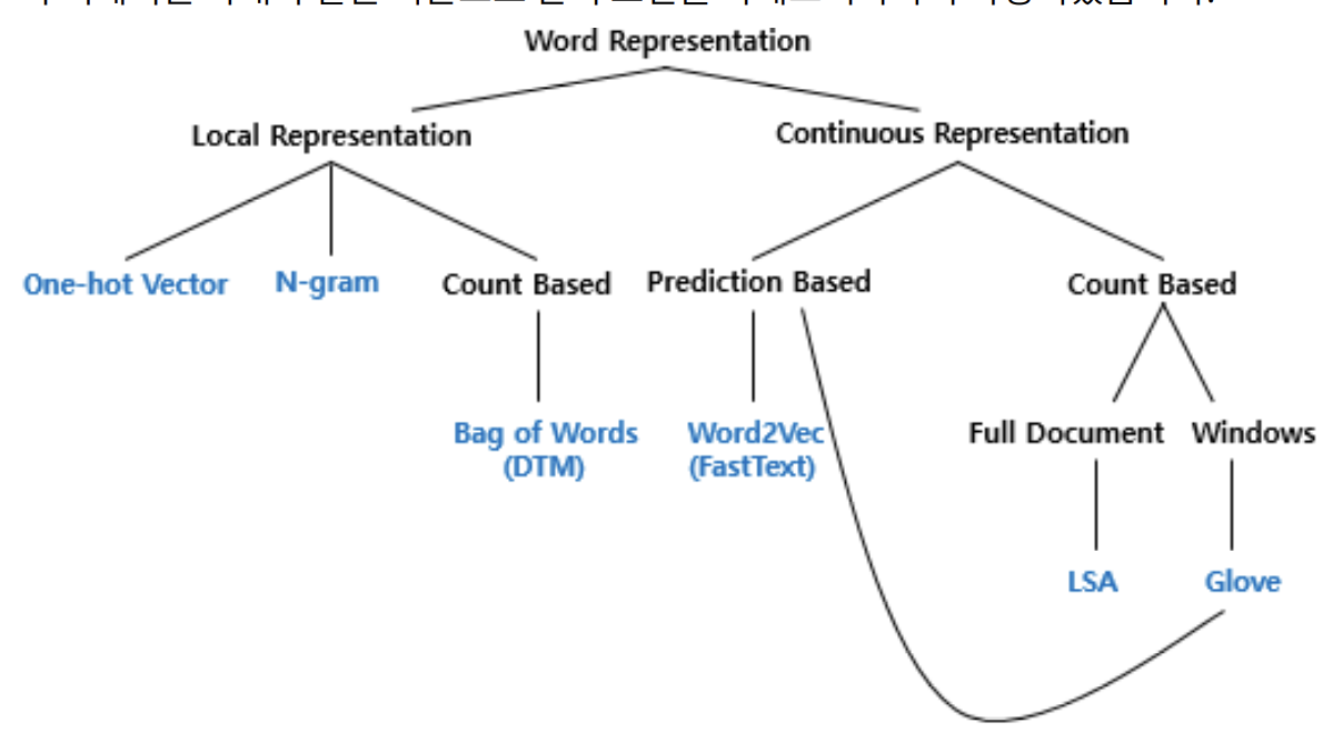 단어의 표현 방법은 크게 국소 표현(Local Representation) 방법과 분산 표현 (Distributed Representation) 방법으로 나뉜다. 국소 표현 방법은 해당 단어 그 자체만 보고, 특정값을 매핑하여 단어를 표현하는 방법이며, 분산 표현 방법은 그 단어를 표현하고자 주변을 참고하여 단어를 표현하는 방법이다.